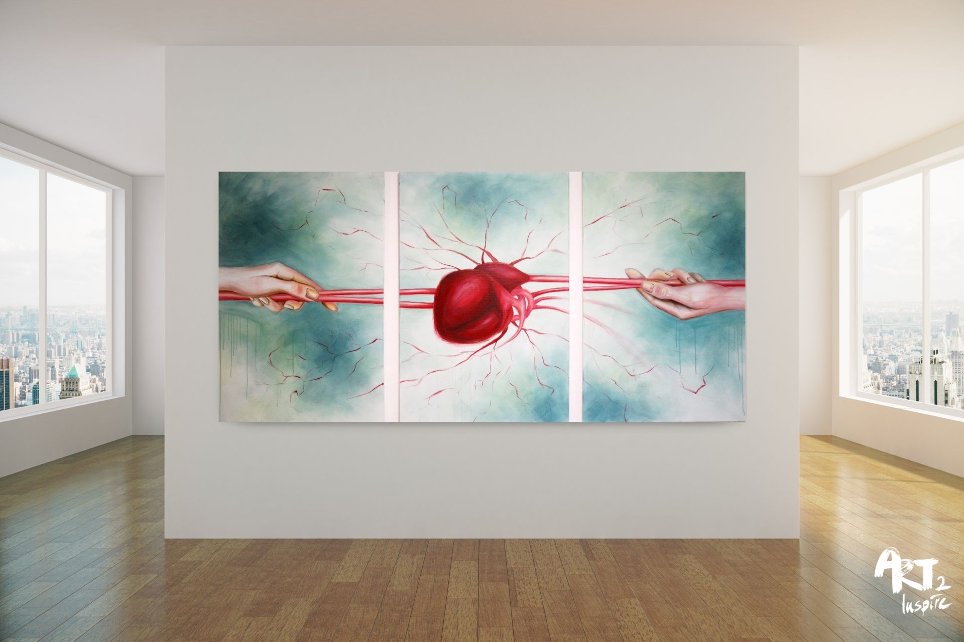 "Mittelpunkt des Triptychons ist ein anatomisch geformtes Herz mit Arterien und Venen. Links und rechts davon zieht an den Blutgefäßen jeweils eine Hand.
